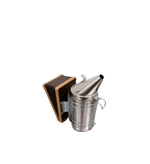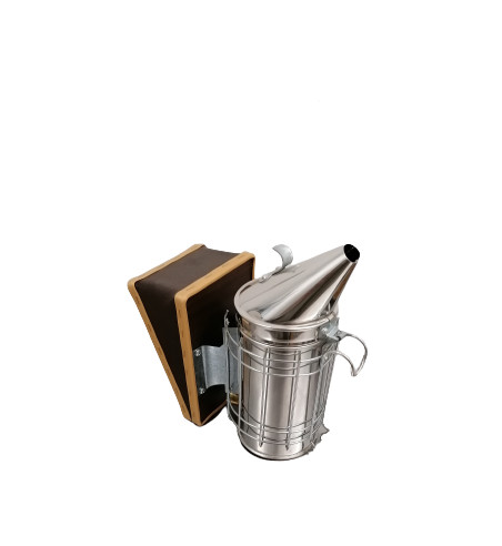 Fumigador de abelhas feito de aço inoxidável com grelha de proteção.